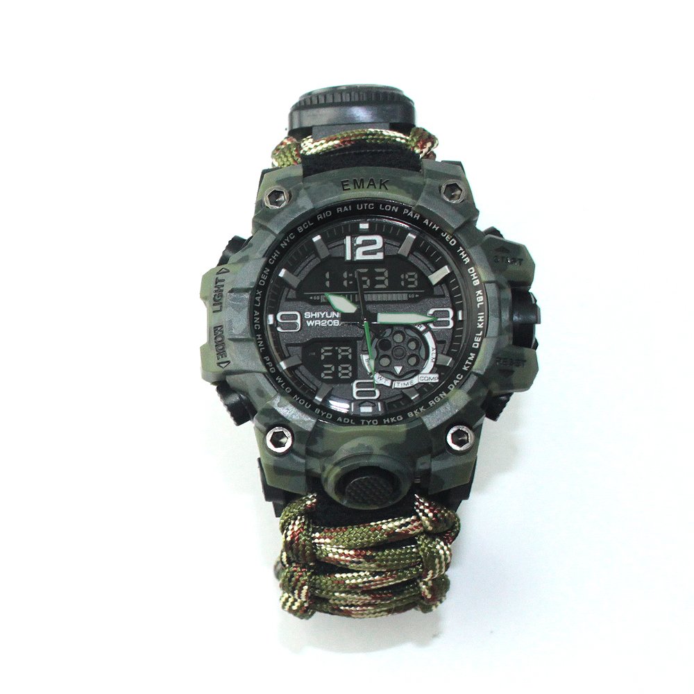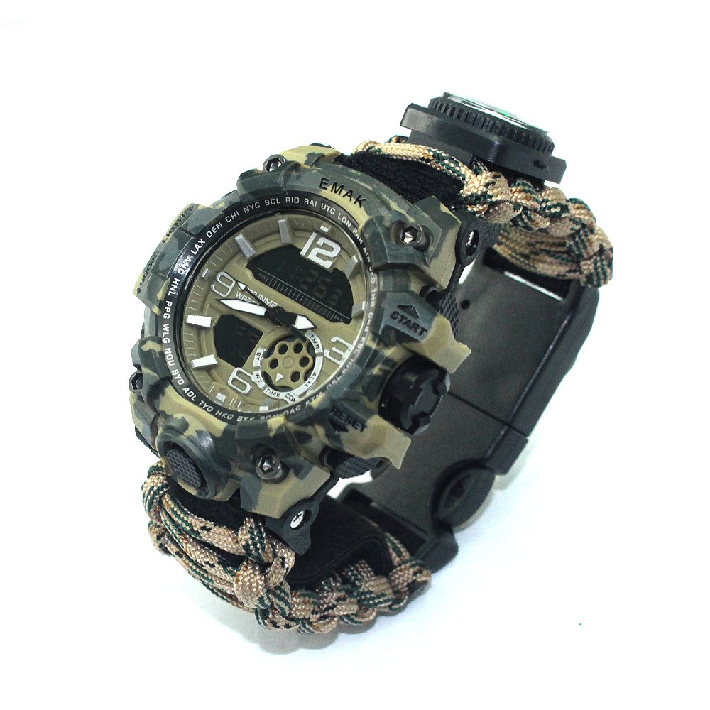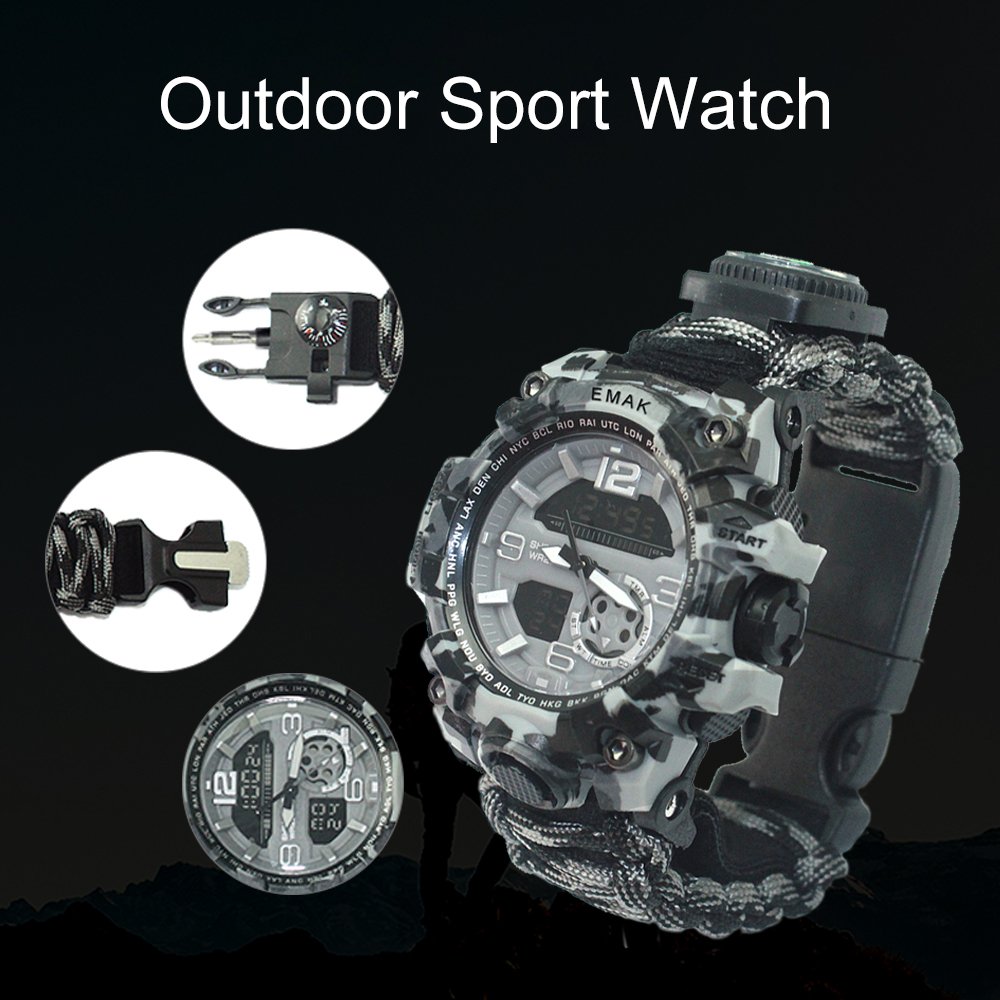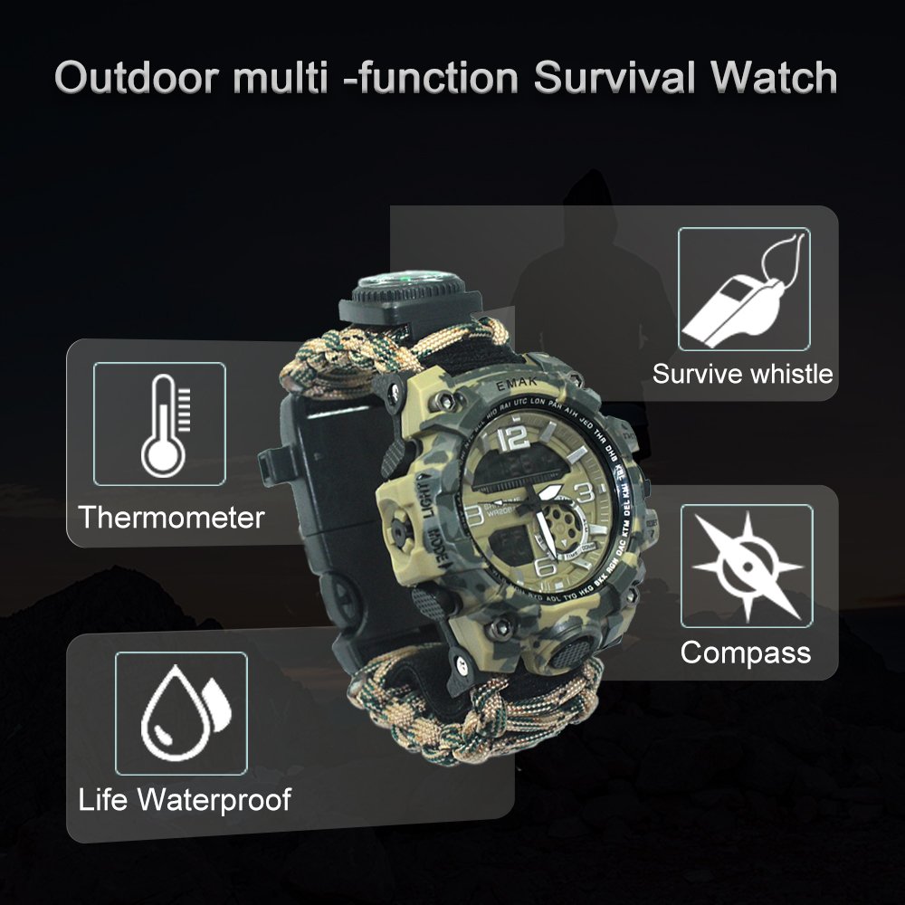 The Outdoor Paracord Life-Saving Watch is an essential companion for outdoor enthusiasts, offering multiple survival functions in one compact and durable design. Made with high-strength seven-core paracord, this watch is built to endure harsh conditions and provide reliable support during emergencies. Whether you’re camping, hiking, or mountaineering, it combines practicality with versatility, ensuring you’re prepared for a variety of situations. The watch features a comfortable 2.5cm wide band and comes in two sizes—small (23.5cm) and large (25.5cm)—to suit different wrist sizes. Weighing just 85g, it’s lightweight and easy to carry, making it a convenient addition to your gear. The integrated whistle allows you to signal for help in emergencies, the lighter works even in wet or high-altitude environments to start fires, and the compass ensures you can navigate in unfamiliar terrain. A built-in thermometer lets you monitor the ambient temperature, helping you better prepare for changing weather conditions, while the scraper serves as a practical tool for cutting or stripping in survival scenarios. Of course, the watch also provides accurate timekeeping, ensuring that you stay on track with your outdoor activities. Powered by button batteries, it guarantees long-lasting performance and is simple to replace. Whether you’re embarking on a long hike, facing sudden wilderness challenges, or simply seeking a reliable piece of gear, this life-saving watch is designed to meet your needs and enhance your outdoor experience.