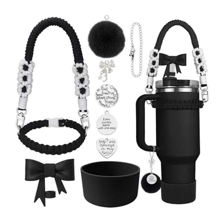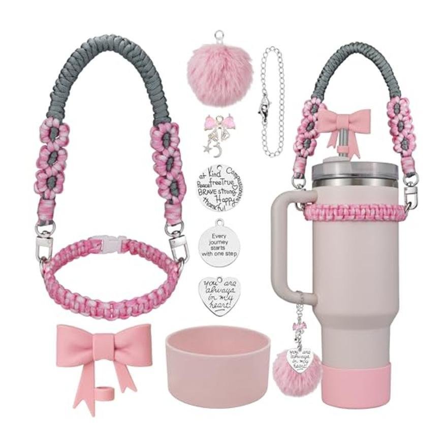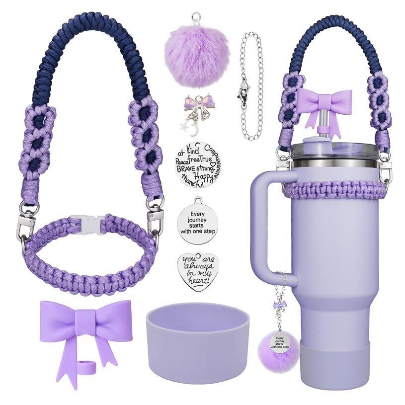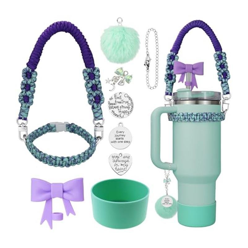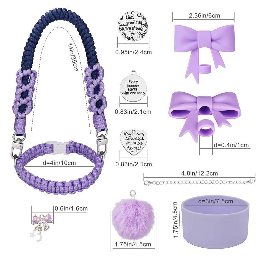 This versatile paracord water bottle accessories set comes in a variety of vibrant colors, allowing you to choose the perfect match for your style. The set includes a durable, adjustable paracord handle and keychain, both featuring cute bow and pom-pom details for a playful touch. With charming silver pendants adorned with motivational quotes, this kit adds a unique flair to your water bottle. The silicone bottom cover helps protect your bottle from scratches while ensuring durability. Ideal for outdoor activities, gym sessions, or daily hydration, this customizable set is perfect for those who love personalized accessories.
