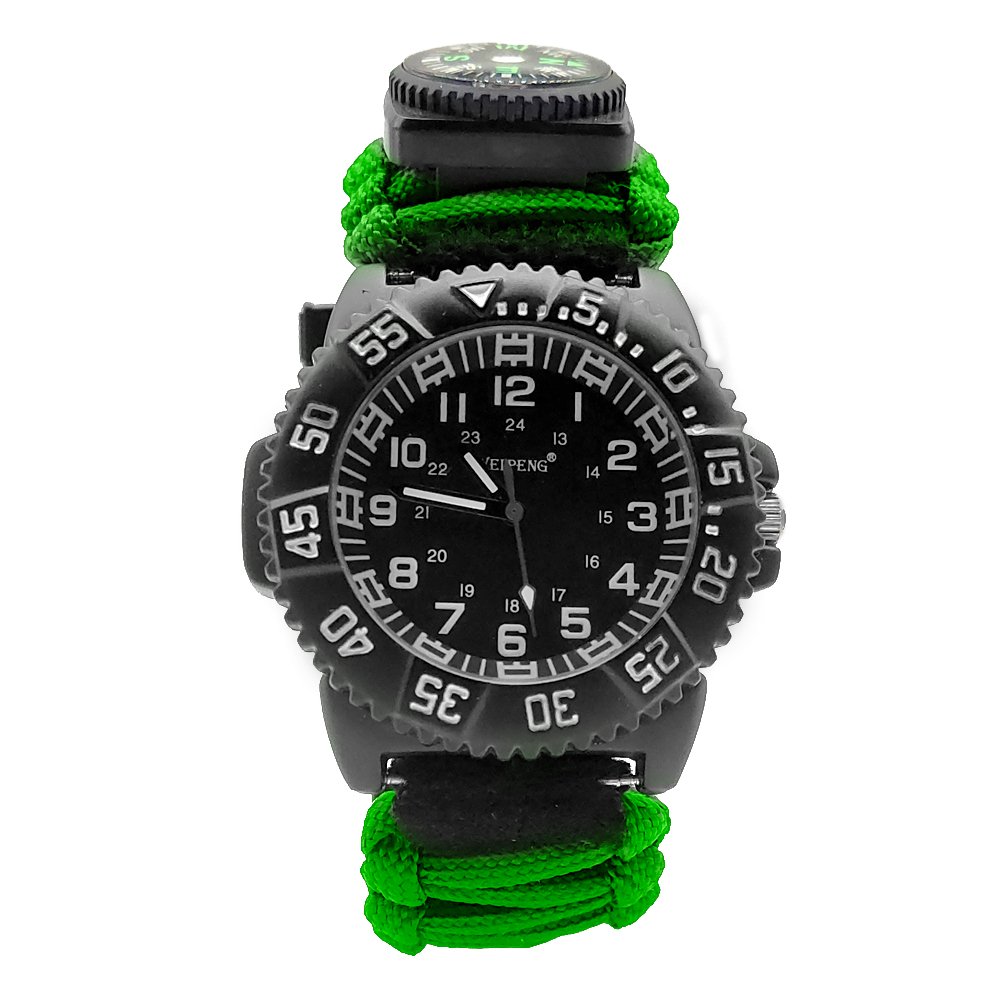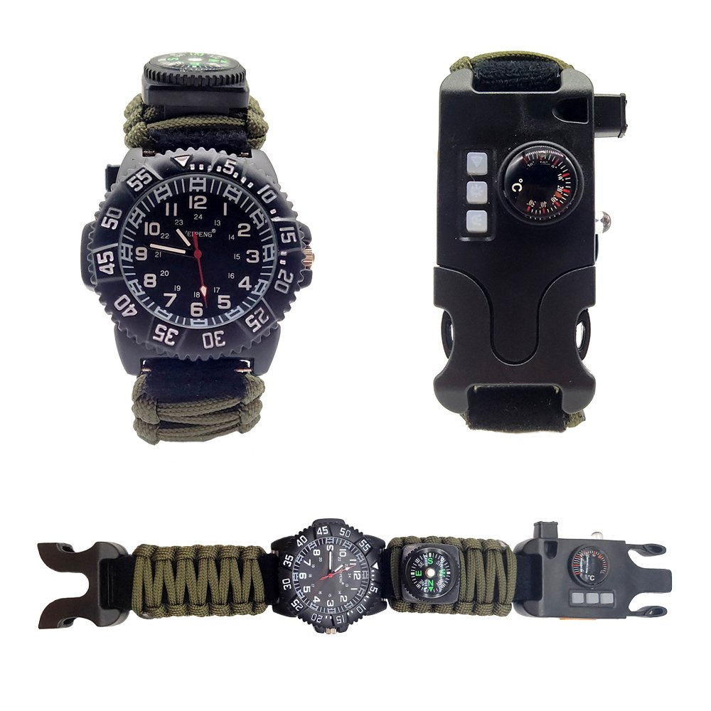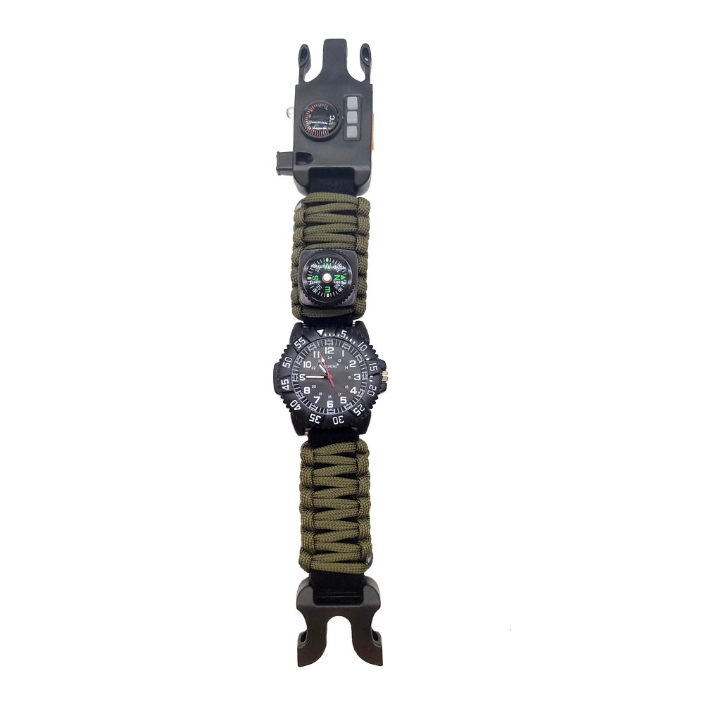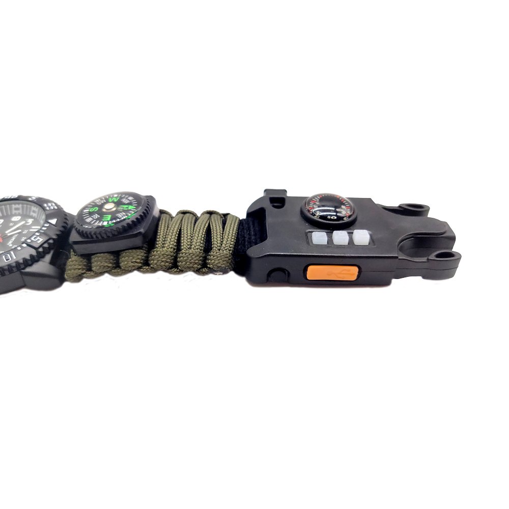 This multifunctional survival watch integrates a variety of practical features, making it an ideal choice for adventurers, campers, and survival enthusiasts. The built-in compass helps you navigate accurately during outdoor activities, preventing you from getting lost. The high-decibel whistle is designed to emit an alarm or distress signal, enhancing safety in emergencies. The watch is also equipped with a practical thermometer to measure the ambient temperature in real-time, allowing you to assess weather conditions and adjust your plans accordingly. The unique Velcro design makes it easy to adjust the watch for comfort, and it can also be used to secure other survival gear. The watch strap is made of durable paracord, which can be used as rope or for other survival purposes in an emergency. The UV light feature provides support for nighttime illumination, helping you check details or offering additional visual assistance. The laser light function can be used for long-distance signaling or location marking, enhancing remote communication capabilities. The integrated flashlight provides high-intensity lighting, ensuring safety and convenience during nighttime activities. The built-in SIM/SD card ejector pin allows for easy removal of SIM cards or SD cards, facilitating the maintenance and use of electronic devices. Additionally, the watch is equipped with a charging interface that allows you to connect external devices for charging, ensuring that your equipment remains powered during extended use. Whether for wilderness exploration, camping, hiking, or emergency situations, this survival watch offers comprehensive support and protection, helping you safely navigate through various challenging environments.