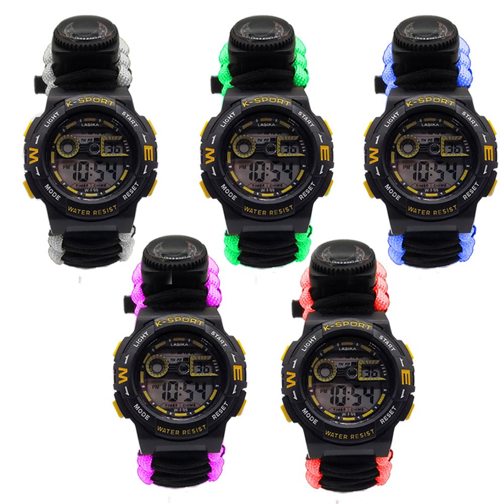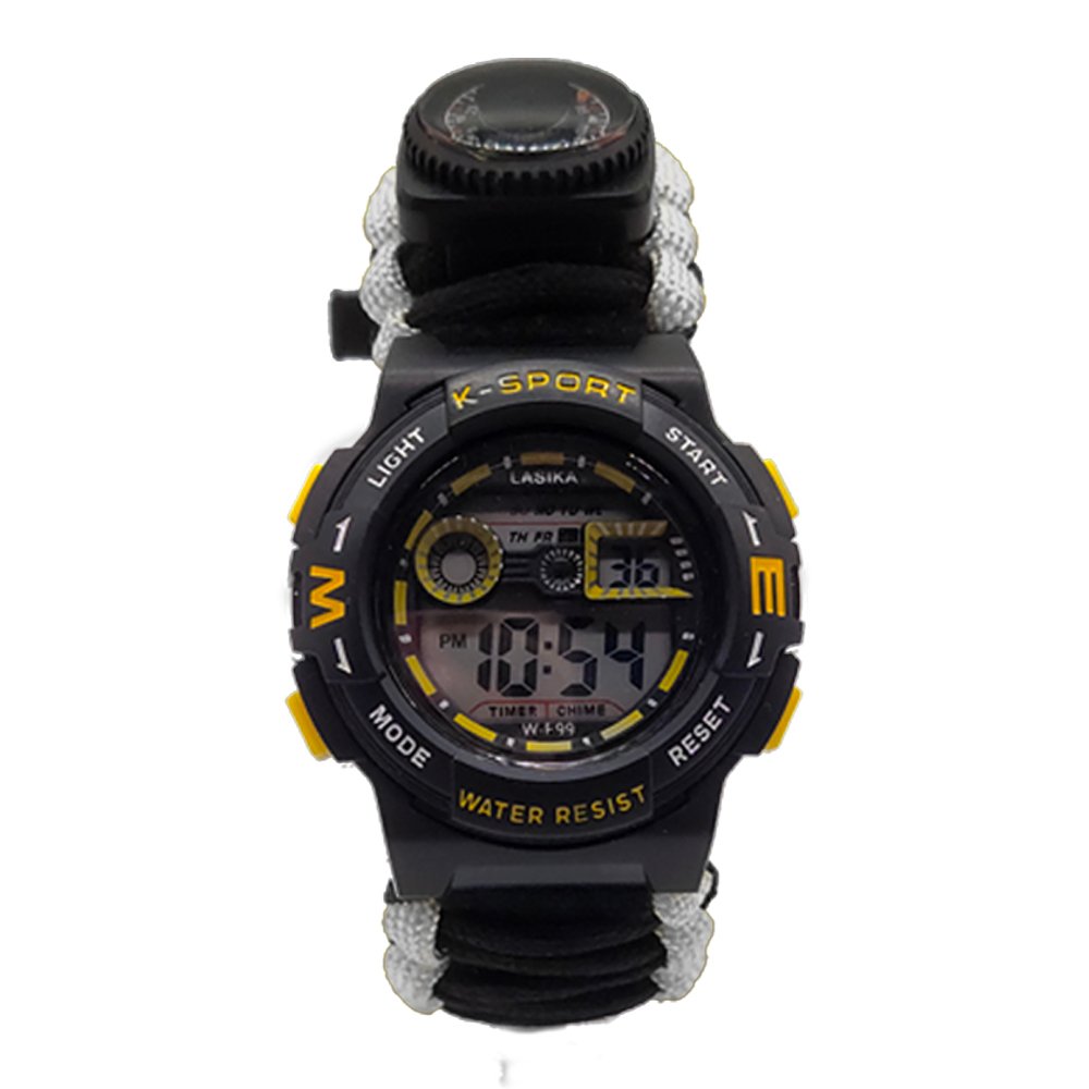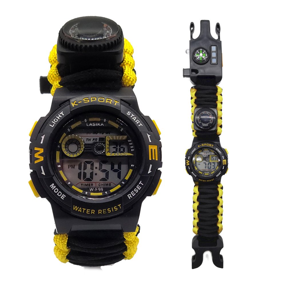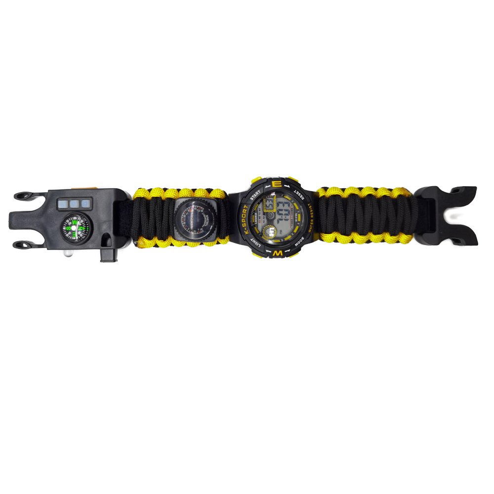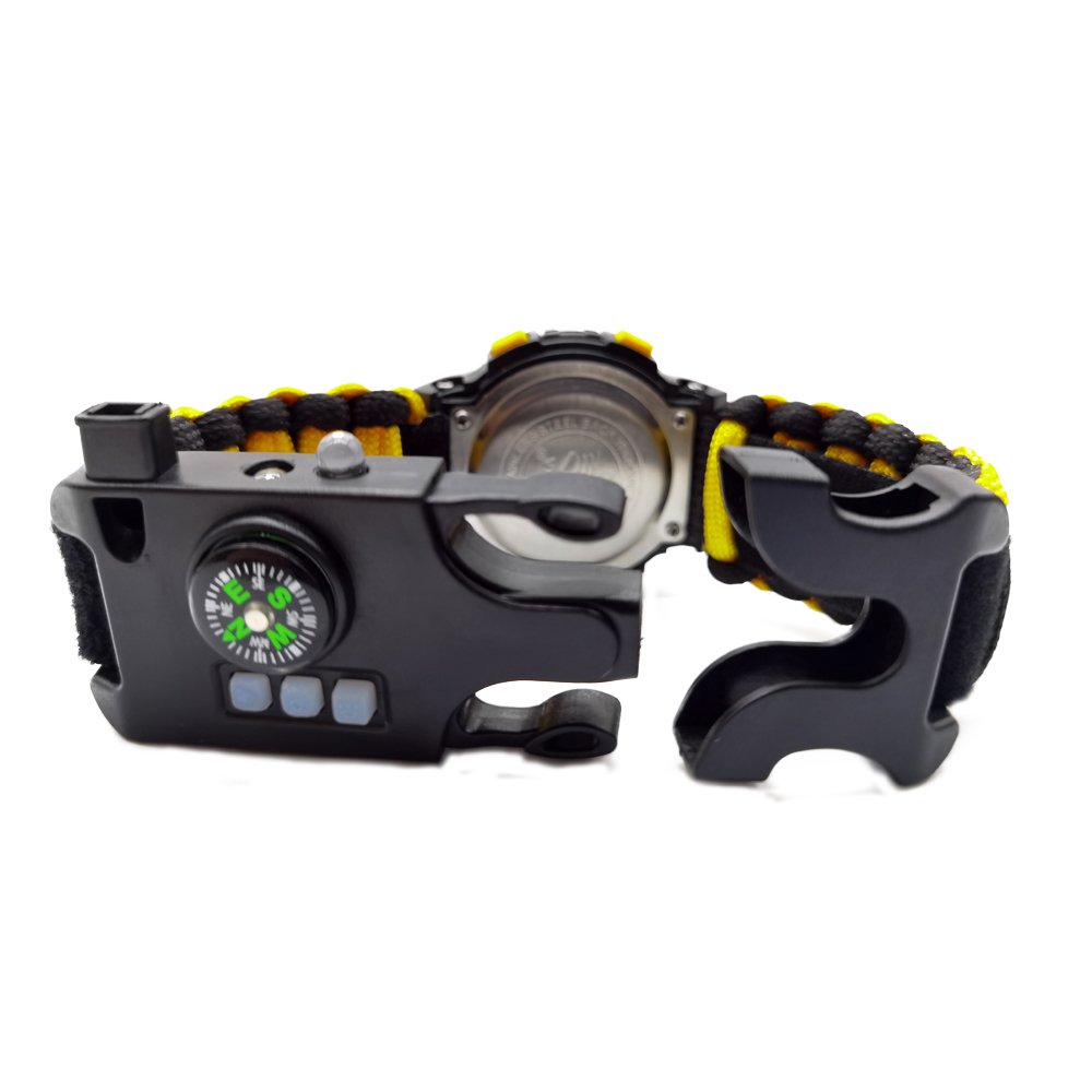 This outdoor multifunction paracord watch is an ideal piece of gear designed for adventure enthusiasts and outdoor activities, combining multiple practical features to meet various survival and convenience needs. The watch measures 25cm x 3.3cm and weighs only 68 grams, making it lightweight yet powerful, making it the perfect choice for a multifunctional tool. In addition to the traditional time display, the watch integrates several useful accessories, including a whistle, UV light, laser pointer, flashlight, compass, thermometer, SIM card removal pin, reflective plate, carabiner, and paracord. The whistle can be used to signal an alarm or attract attention, enhancing safety; the UV light is suitable for checking currency or fluorescent objects at night; the laser pointer can be used as a signal or indicator; the flashlight provides clear illumination in dark camping environments or during nighttime hiking; the compass helps you navigate accurately on your adventures, preventing you from getting lost; the thermometer allows you to monitor the surrounding temperature in real time, helping you plan your activities accordingly; the SIM card removal pin makes it easy to remove SIM cards or other small cards; the reflective plate increases visibility, ensuring safety in emergency situations; the carabiner can be used to secure the watch or attach it to your backpack for easy carrying; and the paracord can be unraveled and used for various emergency purposes. The watch is made from high-strength materials to ensure it maintains excellent performance in harsh environments. The paracord weave design not only enhances the watch’s durability but also provides additional support and convenience in emergency situations. Its lightweight design ensures you won’t feel burdened while wearing it. With its multifunctionality, this watch is perfect for outdoor adventures, camping, hiking, and daily use, meeting your practical needs while offering convenience and safety, making every adventure worry-free. The modern and practical design ensures that the watch is both functional and stylish, allowing you to express your personality and style, whether for outdoor activities or everyday wear. Choose this outdoor multifunction paracord watch to make it a reliable companion on your adventure journey, providing you with more support and safety.