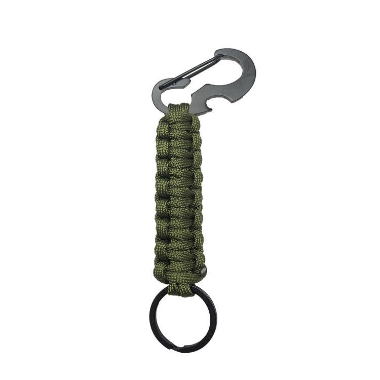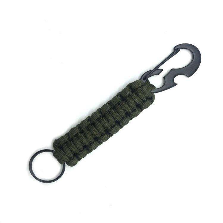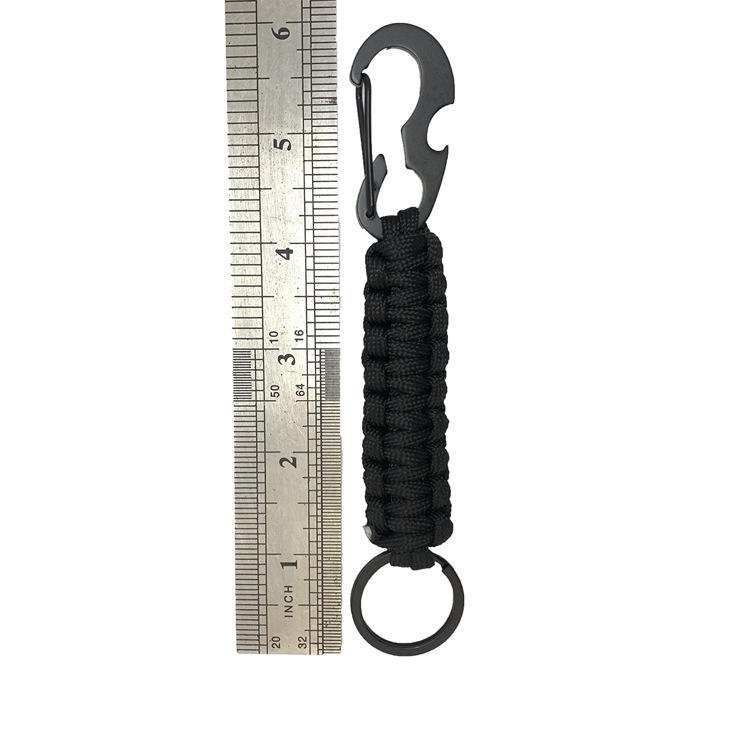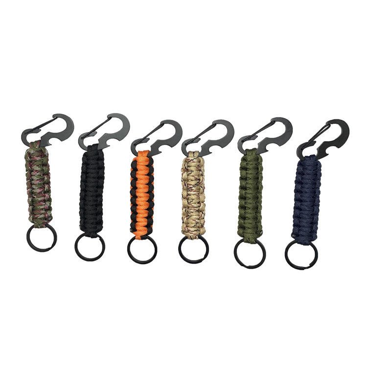 A paracord carabiner, also known as a paracord keychain or paracord clip, is a versatile and practical tool that combines the functionality of a standard carabiner with the utility of a paracord rope. The carabiner itself is typically made of durable materials such as aluminum, steel, or other strong alloys, which makes it ideal for securing, attaching, or carrying items. The key feature of a paracord carabiner is the paracord wrapped around the carabiner, usually in a tightly wound, braided pattern. Paracord is a lightweight but extremely strong nylon rope originally developed by the military for parachute suspensions. It has a wide variety of survival and practical uses due to its strength, flexibility, and ease of use. The primary function of a paracord carabiner is to provide a quick and easy way to carry essential items in outdoor activities such as hiking, camping, or climbing. The carabiner itself can be used to clip onto gear like backpacks, tents, or other items, allowing for hands-free carrying. This is particularly useful for individuals who need to stay mobile while having access to tools, keys, or other items. Beyond its role as a carrying device, the paracord also serves several critical functions in emergencies. If the user is in a survival situation, the paracord can be unraveled and used for various purposes. The individual strands of the paracord are strong enough to be used for tasks like building shelter, securing equipment, creating traps, or even as a makeshift tourniquet for first aid. In addition to its strength, the paracord is relatively lightweight and compact, which makes it a popular choice for people who want to prepare for emergencies without carrying bulky equipment. The design of the paracord carabiner allows it to be attached to a wide range of gear and accessories, making it a useful multi-purpose tool for adventurers, outdoor enthusiasts, or anyone who needs a reliable, portable solution for carrying and using paracord. Some models also include additional features like built-in bottle openers or small emergency whistles, further increasing their utility. The combination of a sturdy carabiner and durable paracord ensures that this tool is both practical and durable, capable of withstanding the demands of outdoor environments while providing a range of uses in various situations. In summary, the paracord carabiner is an essential tool for outdoor activities, survival scenarios, or everyday use, offering both the convenience of a carabiner and the flexibility of paracord for a wide range of practical applications.