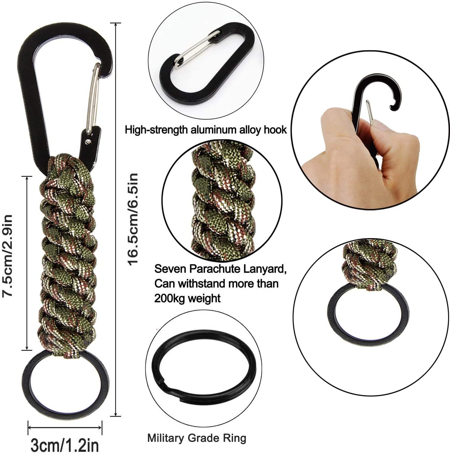 A paracord carabiner, also known as a paracord keychain or paracord clip, is a versatile and practical tool that combines the functionality of a standard carabiner with the utility of a paracord rope. The carabiner itself is typically made of durable materials such as aluminum, steel, or other strong alloys, which makes it ideal for securing, attaching, or carrying items. The key feature of a paracord carabiner is the paracord wrapped around the carabiner, usually in a tightly wound, braided pattern. Paracord is a lightweight but extremely strong nylon rope originally developed by the military for parachute suspensions. It has a wide variety of survival and practical uses due to its strength, flexibility, and ease of use. The primary function of a paracord carabiner is to provide a quick and easy way to carry essential items in outdoor activities such as hiking, camping, or climbing. The carabiner itself can be used to clip onto gear like backpacks, tents, or other items, allowing for hands-free carrying. This is particularly useful for individuals who need to stay mobile while having access to tools, keys, or other items. Beyond its role as a carrying device, the paracord also serves several critical functions in emergencies. If the user is in a survival situation, the paracord can be unraveled and used for various purposes. The individual strands of the paracord are strong enough to be used for tasks like building shelter, securing equipment, creating traps, or even as a makeshift tourniquet for first aid. In addition to its strength, the paracord is relatively lightweight and compact, which makes it a popular choice for people who want to prepare for emergencies without carrying bulky equipment. The design of the paracord carabiner allows it to be attached to a wide range of gear and accessories, making it a useful multi-purpose tool for adventurers, outdoor enthusiasts, or anyone who needs a reliable, portable solution for carrying and using paracord. Some models also include additional features like built-in bottle openers or small emergency whistles, further increasing their utility. The combination of a sturdy carabiner and durable paracord ensures that this tool is both practical and durable, capable of withstanding the demands of outdoor environments while providing a range of uses in various situations. In summary, the paracord carabiner is an essential tool for outdoor activities, survival scenarios, or everyday use, offering both the convenience of a carabiner and the flexibility of paracord for a wide range of practical applications.